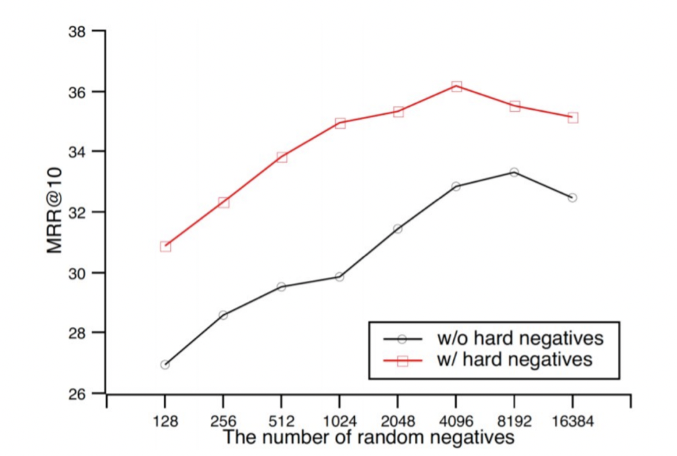 在同一張圖中,我們觀察到包含難負樣本也能提高效能。難負樣本是指很難與 區分的樣本 。在我們的例子中,它可能是“法國的首都是什麼?”和“美國的首都是什麼?”這樣的配對,它們語義內容相近,需要精確理解整個句子才能正確回答。相反,“法國的首都是什麼?”和“有多少部星球大戰電影?”這樣的樣本則較容易區分,因為它們不屬於同一主題。