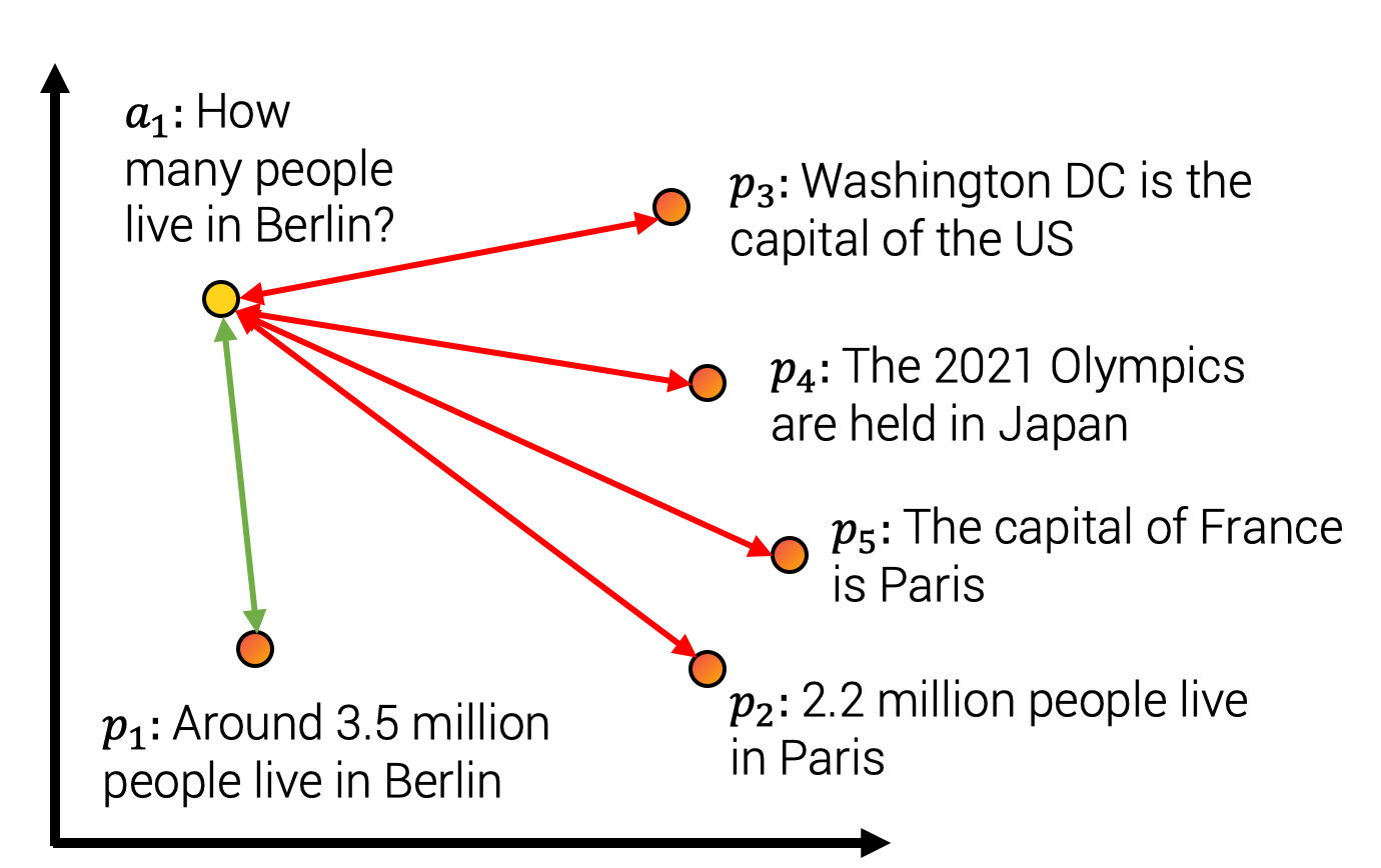 直觀地講,模型應該將句子“柏林有多少人居住?”和“大約有350萬人居住在柏林”分配高相似度,而將其他負面答案(例如“法國的首都是巴黎”)分配低相似度,如下圖所示。