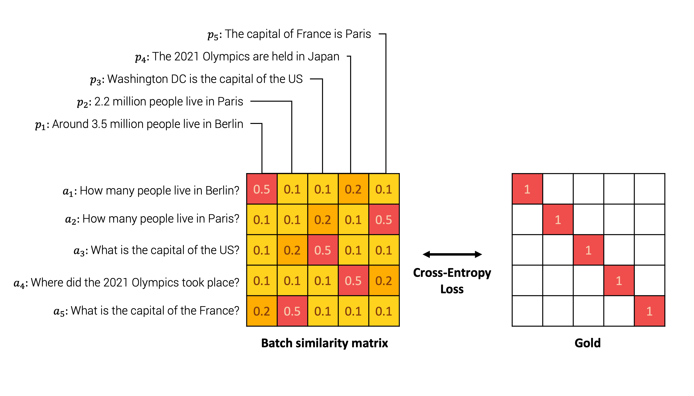 一個說明性的例子如下。模型首先嵌入批處理中每個句子對中的每個句子。然後,我們計算每對可能的 之間的相似度矩陣。然後,我們將相似度矩陣與表示原始配對的真值進行比較。最後,我們使用交叉熵損失進行比較。