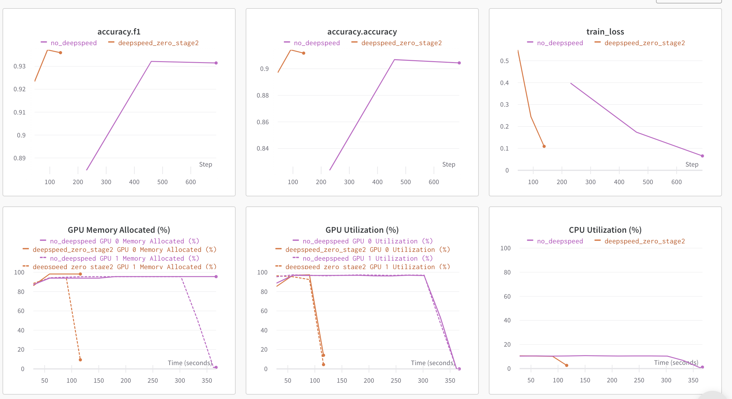 。它與此處的官方文字分類示例類似,但增加了測量訓練和評估時間的邏輯。讓我們比較多 GPU 設定中分散式資料並行(DDP)和 DeepSpeed ZeRO Stage-2 的效能。