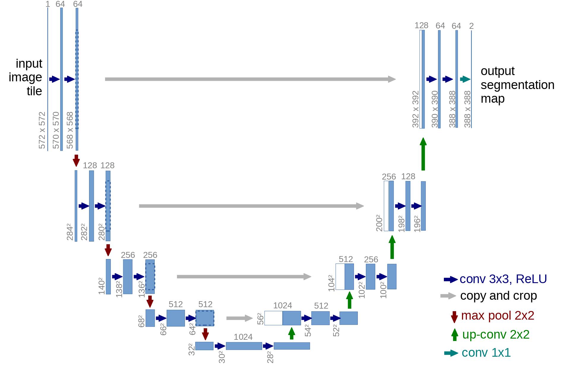 可以看出,U-Net 模型首先對輸入進行下采樣(即在空間解析度方面使輸入變小),然後執行上取樣。