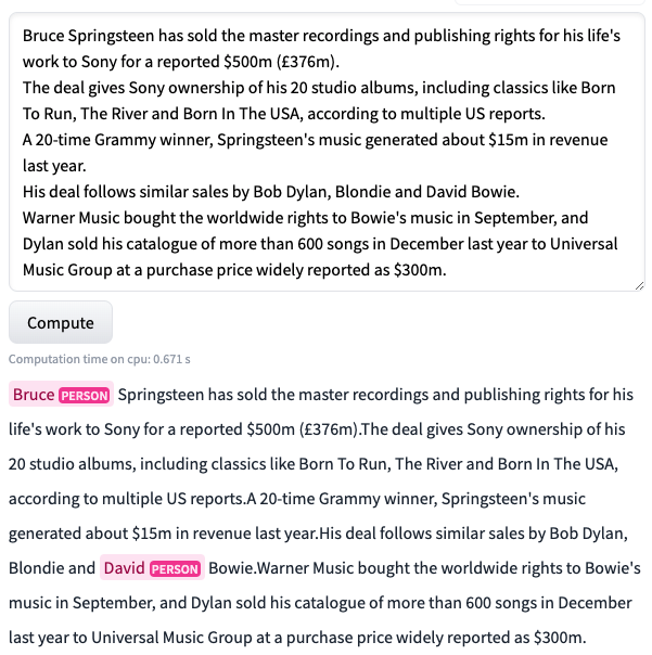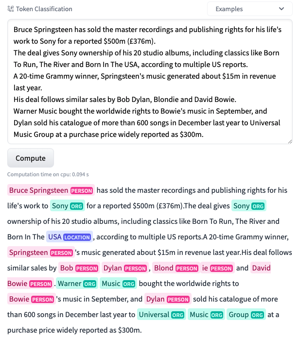 所以,我們現在能夠以 98.67% 的準確率對資料集中的文章進行分類!但是等等,我們之前談論的是主動學習和 Prodigy。它們去哪兒了?🤔 我們確實使用了 Prodigy,我們很快就會看到。我們用它來為這個資料集進行命名實體識別任務的標註。在開始標註部分之前,我們覺得如果能有一個專案,不僅能檢測新聞文章中的實體,還能對它們進行分類,那就太酷了。這就是為什麼我們基於現有的標籤構建了這個分類模型。