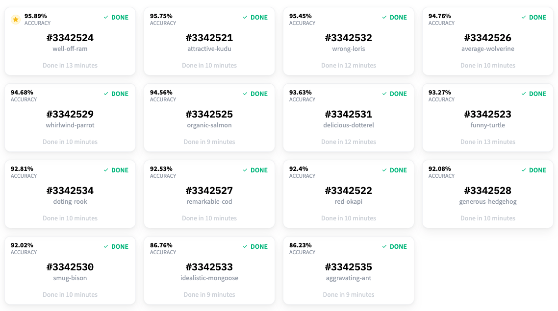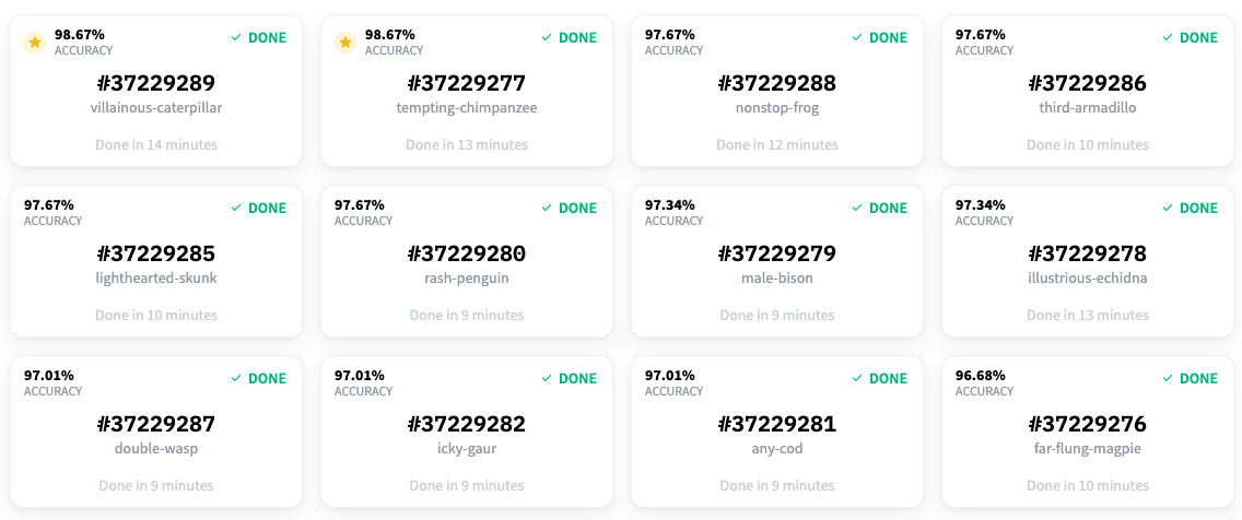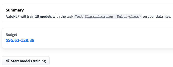 請注意,在上面的例子中,我們正在訓練 15 個不同的多類別分類模型。AutoNLP 的定價可以低至每個模型 10 美元。AutoNLP 會自動為你選擇最佳模型並進行超引數調優。所以,現在我們只需要坐下來,放鬆,等待結果。