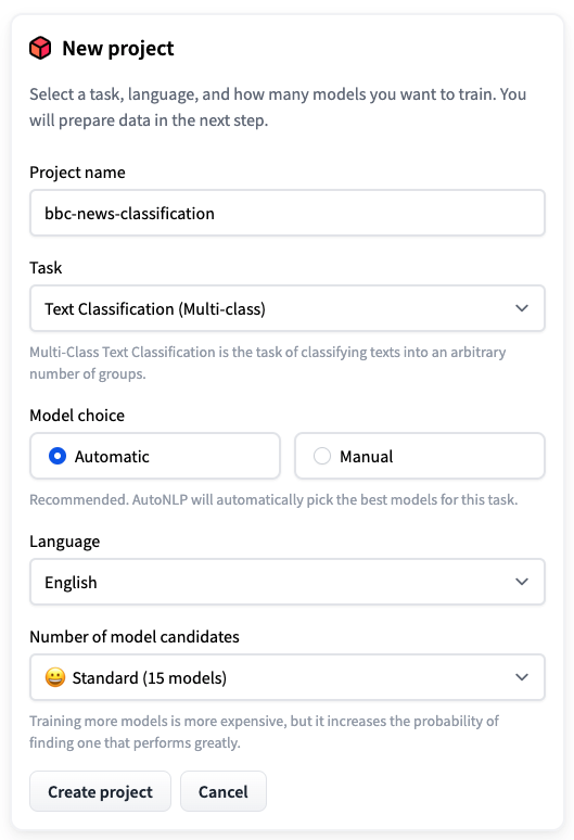 步驟 2:開啟 AutoNLP 並建立一個新專案。