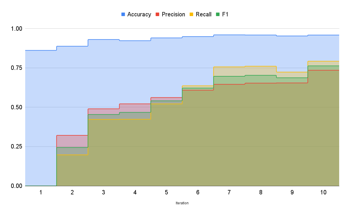哇!這太棒了!正如你所看到的,模型現在的表現非常出色!它能夠檢測出同一文字中的許多實體。精確率和召回率仍然有點低,因此我們繼續標註更多資料。在標註了大約 250 個樣本後,我們在精確率和召回率方面取得了最好的結果。準確率上升到約 95.9%,精確率和召回率分別為 0.73 和 0.79。此時,我們決定停止標註並結束實驗過程。下圖顯示了隨著我們向資料集中新增更多樣本,最佳模型的準確率是如何提高的