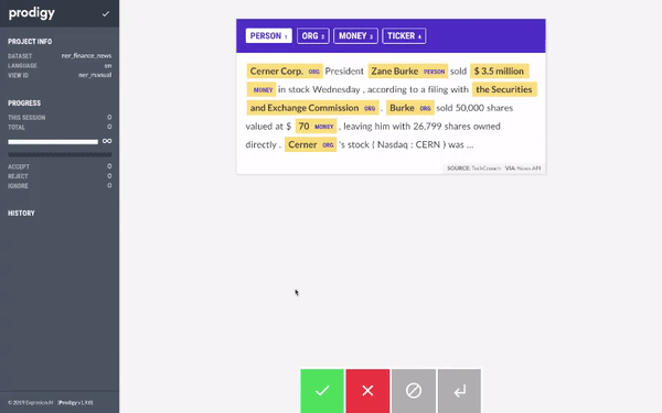 執行上述命令後,你可以訪問 prodigy 的網頁介面(通常在 localhost:8080)並開始標註資料集。Prodigy 的介面非常簡單、直觀且易於使用。介面如下所示