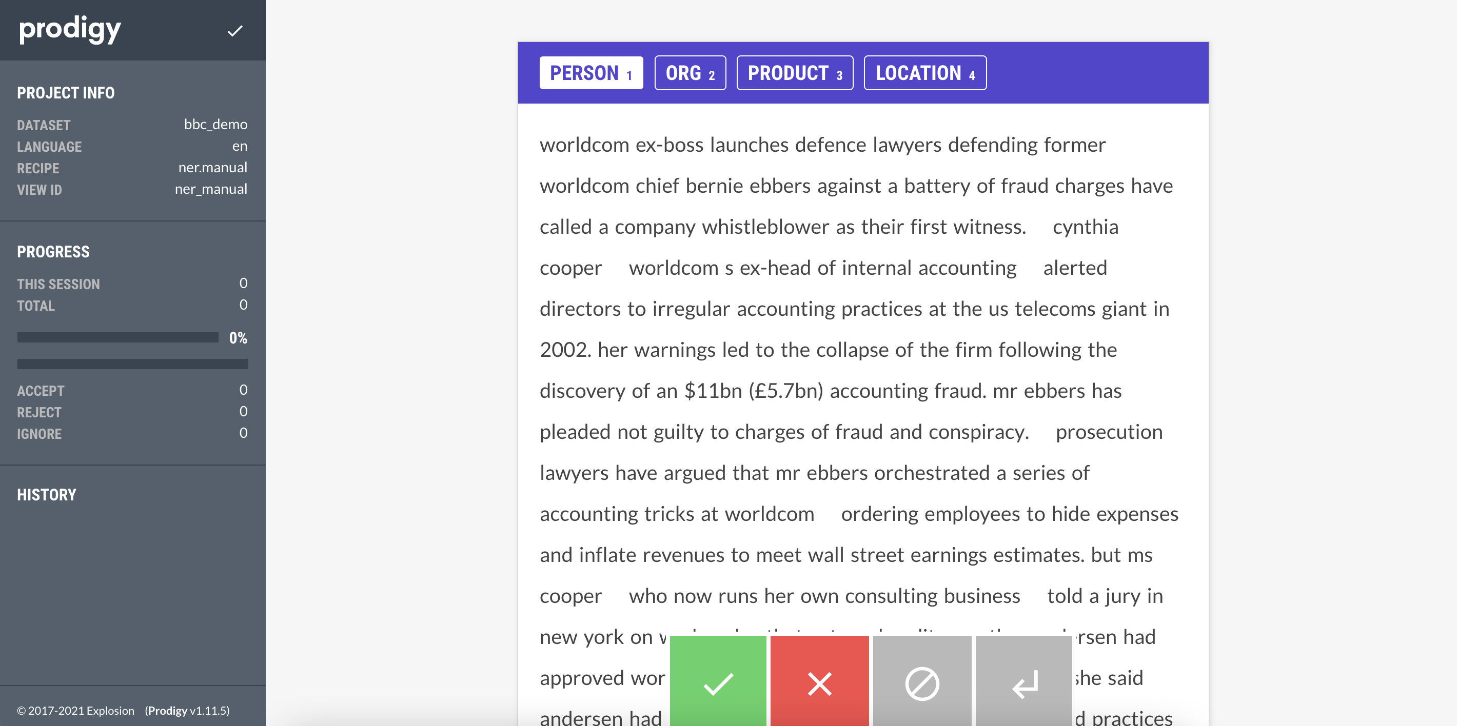 你所要做的就是選擇要標註的實體(PERSON, ORG, PRODUCT, LOCATION),然後選擇屬於該實體的文字。完成一個文件後,你可以點選綠色按鈕,Prodigy 會自動為你提供下一個未標註的文件。