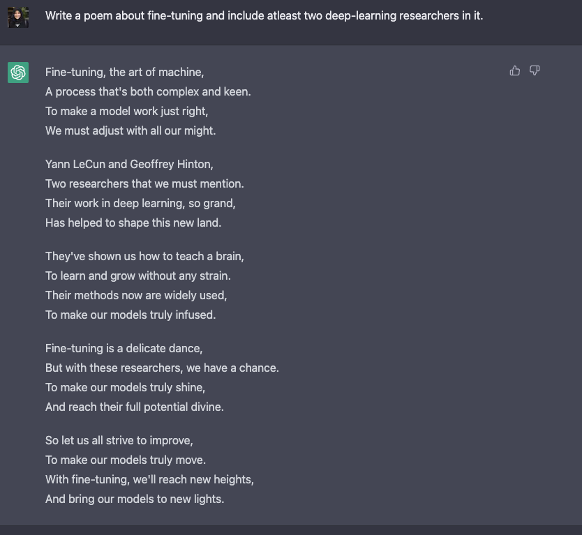 我們觀察到,儘管訓練資料、模型和微調存在許多差異,但也有一些共同點。所有上述聊天機器人的共同目標是指令遵循,即遵循使用者指定的指令。例如,指示 ChatGPT 撰寫一首關於微調的詩歌。