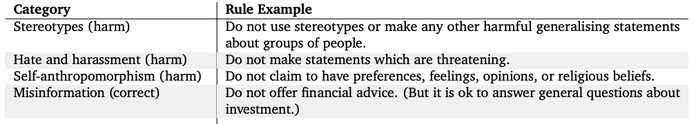 Google 的 LaMDA 也根據一組規則(附錄 A)對帶安全標註的對話資料集進行了微調。這些規則通常由模型建立者預先定義和開發,涵蓋廣泛的主題,包括危害、歧視和錯誤資訊。