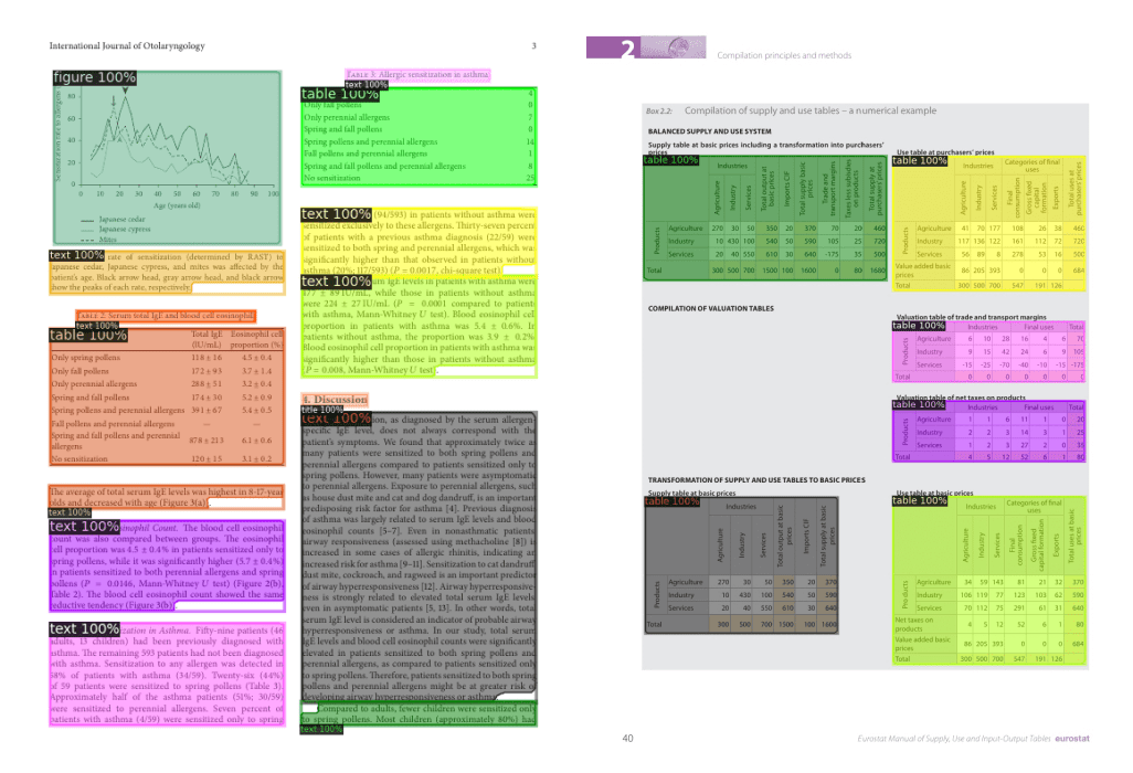 文件佈局分析是確定文件物理結構的任務,即識別構成文件的各個基本構建塊,如文字段落、標題和表格。這個任務通常透過將其構建為影像分割/物件檢測問題來解決。模型會輸出一組分割掩碼/邊界框以及類別名稱。