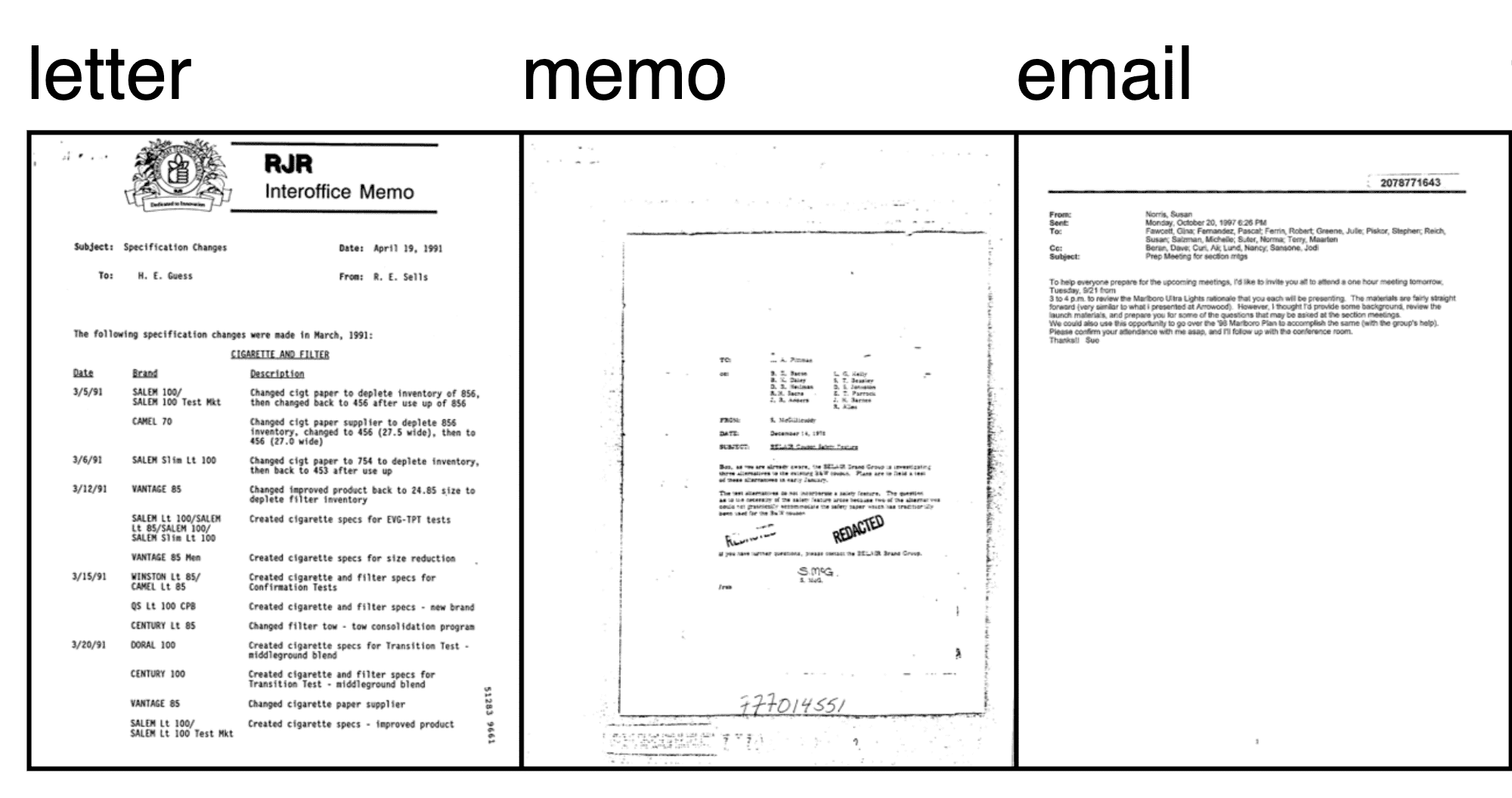 一種基本方法是在文件影像上應用 OCR,然後使用類似 BERT 的模型進行分類。然而,僅依賴 BERT 模型並未考慮任何佈局或視覺資訊。下圖來自 RVL-CDIP 資料集,展示了不同型別文件在視覺結構上的差異。