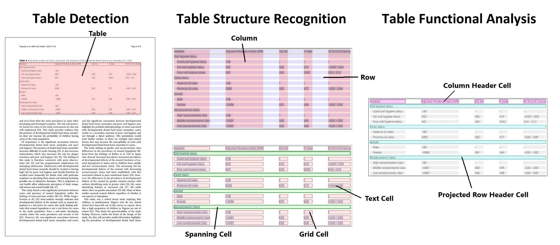 文件中通常包含表格,而大多數 OCR 工具在處理表格資料時效果並不理想。表格檢測是識別表格在文件中位置的任務,表格提取則是建立這些資訊的結構化表示。表格結構識別是識別構成表格的各個部分,如行、列和單元格的任務。表格功能分析 (FA) 則是識別表格的鍵和值的任務。下圖來自 Table Transformer,它說明了這些不同子任務之間的區別。