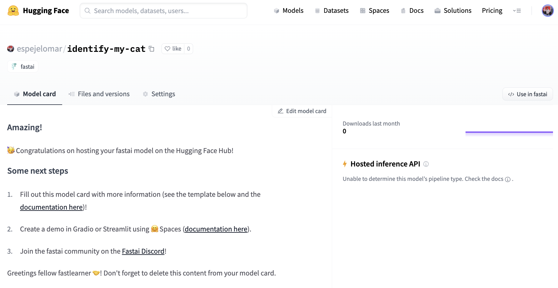 該 `Learner` 現在位於 Hub 中,倉庫名為 `espejelomar/identify-my-cat`。一個自動模型卡已建立,其中包含一些連結和後續步驟。上傳 fastai `Learner`(或任何其他模型)到 Hub 時,編輯其模型卡(下圖)以幫助他人更好地理解您的工作會很有幫助(請參閱Hugging Face 文件)。
