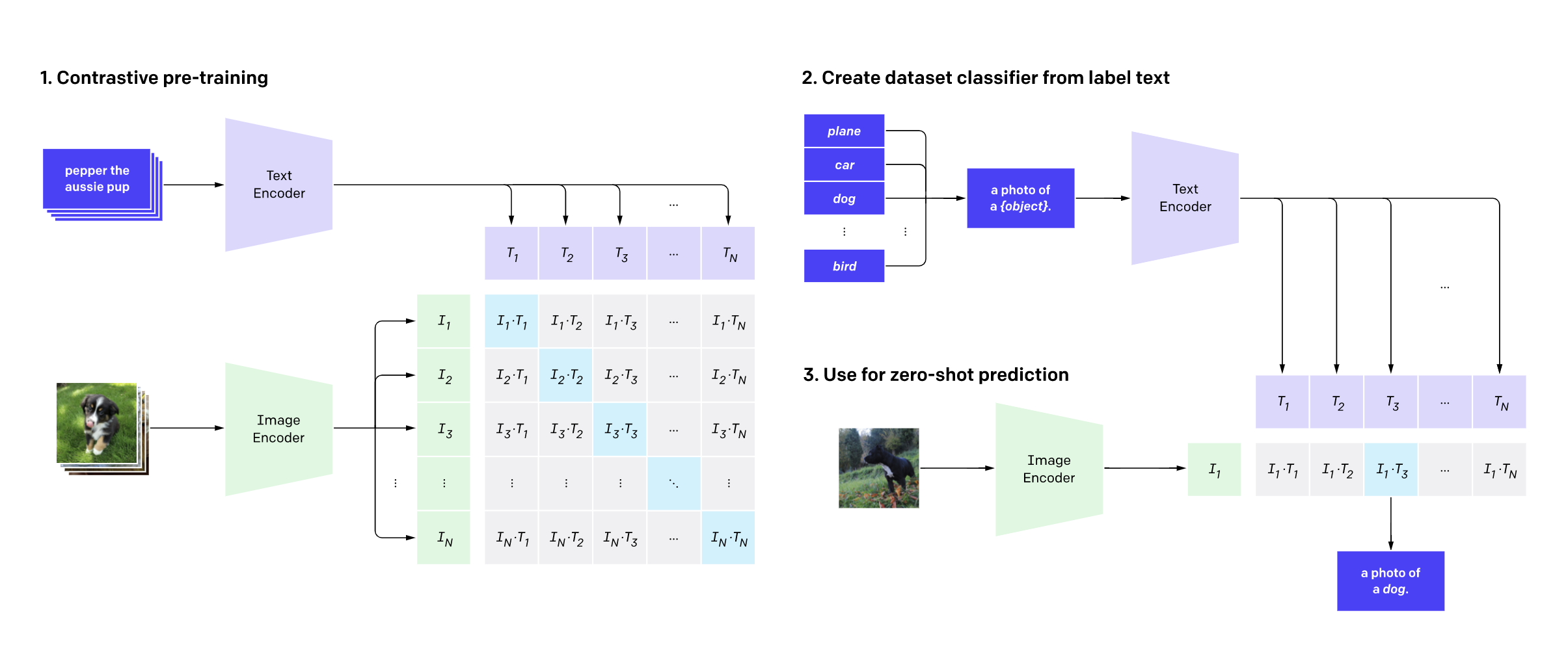 我們的模型是原始 CLIP 模型(如下所示)的微調版本。模型的輸入是分別透過 CLIP 文字編碼器和影像編碼器傳遞的一批說明和一批影像。訓練過程使用 對比學習 來學習影像和說明的聯合嵌入表示。在這個嵌入空間中,影像及其各自的說明會相互靠近,類似的影像和類似的說明也是如此。相反,不同影像的影像和說明,或不相似的影像和說明,則可能被推得更遠。