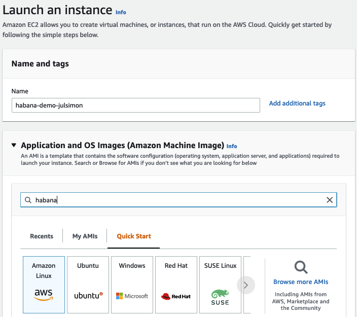 從 us-east-1 區域的 EC2 控制檯開始,我首先點選 啟動例項 併為例項定義一個名稱 (“habana-demo-julsimon”)。