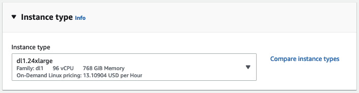 接著,我選擇了 dl1.24xlarge 例項大小(這是唯一可用的大小)。