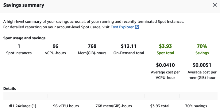 最後但同樣重要的是,我終止了 EC2 例項以避免不必要的費用。檢視 EC2 控制檯中的節省摘要,我看到由於使用了競價例項,我節省了 70% 的費用,每小時只需支付 3.93 美元,而不是 13.11 美元。