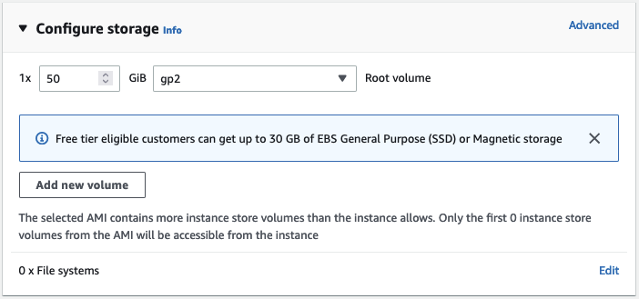 預設情況下,這個 AMI 將啟動一個帶有 8GB Amazon EBS 儲存的例項,這在這裡是不夠的。我將儲存空間增加到 50GB。