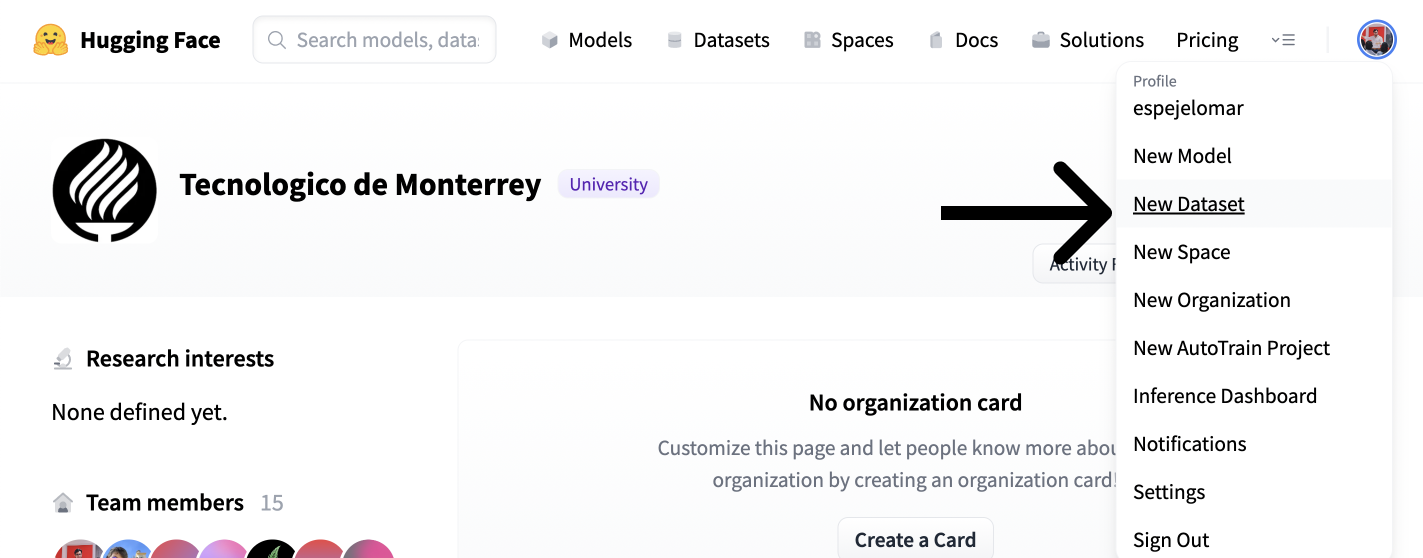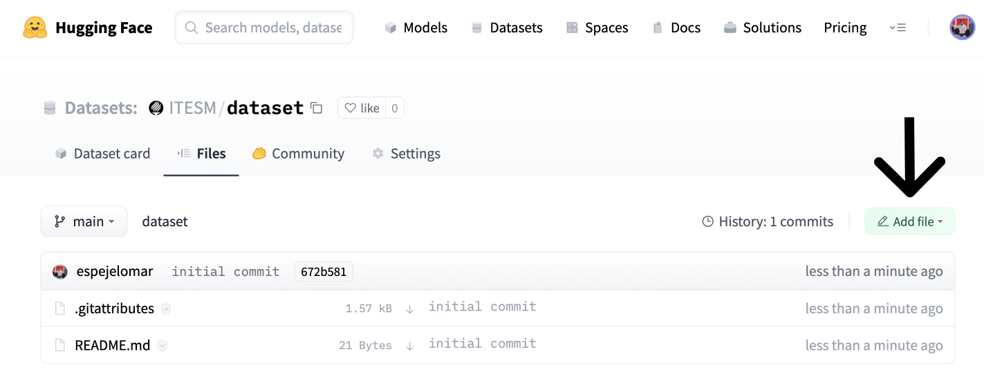 🤗 Datasets 是一個用於快速訪問和共享資料集的庫。讓我們使用使用者介面(UI)在 Hub 中託管嵌入資料集。然後,任何人都可以用一行程式碼載入它。您還可以使用終端共享資料集;請參閱文件瞭解步驟。在本條目的配套筆記本中,您將能夠使用終端共享資料集。如果您想跳過本節,請檢視包含嵌入式常見問題的 `ITESM/embedded_faqs_medicare` 儲存庫。