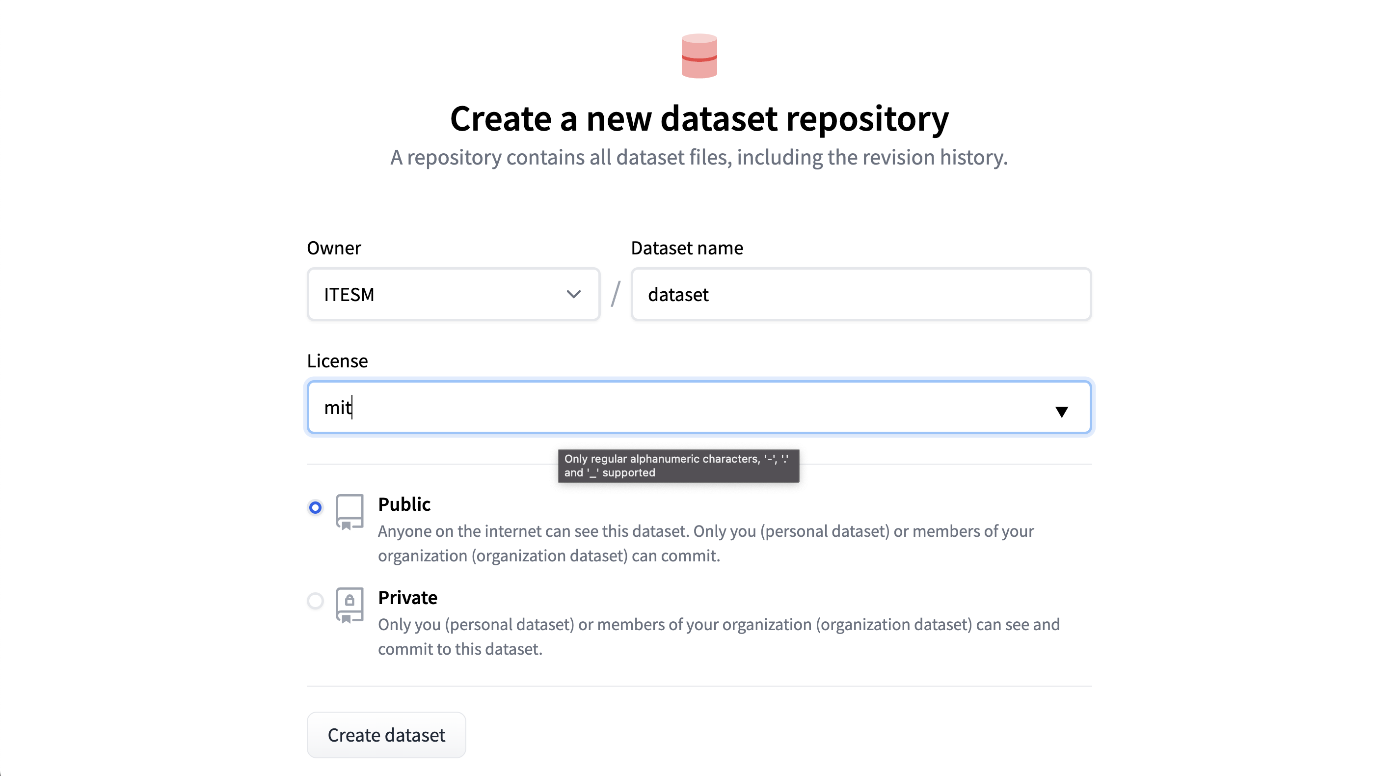- 選擇資料集的所有者(組織或個人)、名稱和許可證。選擇您希望它是私有還是公開。建立資料集。