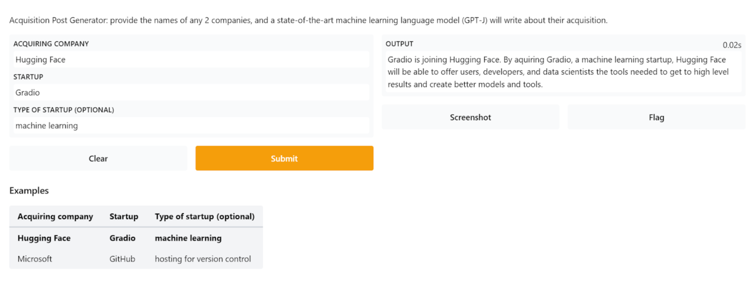 嗯,上面這種關於收購的段落太常見了,以至於演算法都能寫出來。事實上,它確實是演算法寫的!這第一段就是用 Hugging Face Spaces 上的一個機器學習演示 「收購公告生成器」寫的。你可以在瀏覽器中親自執行它:只需提供任意兩家公司的名稱,你就能得到一篇聽起來很合理的收購公告文章的開頭部分!