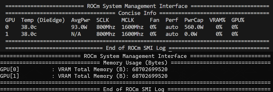 一個具有 128 GB 高頻寬記憶體的 AMD Instinct MI250 GPU 具有兩個獨立的 ROCm 裝置(GPU 0 和 1),每個裝置具有 64 GB 高頻寬記憶體。