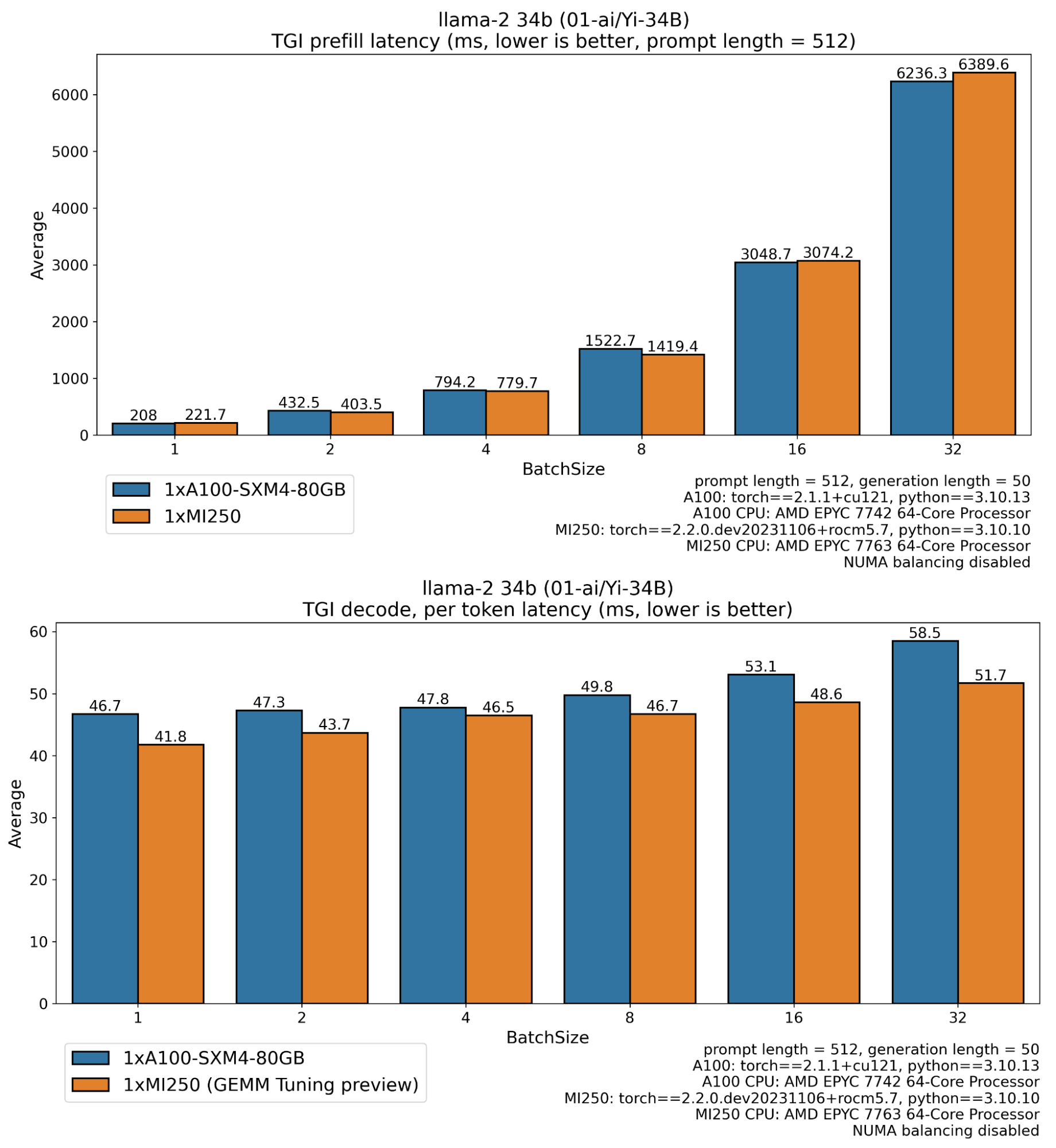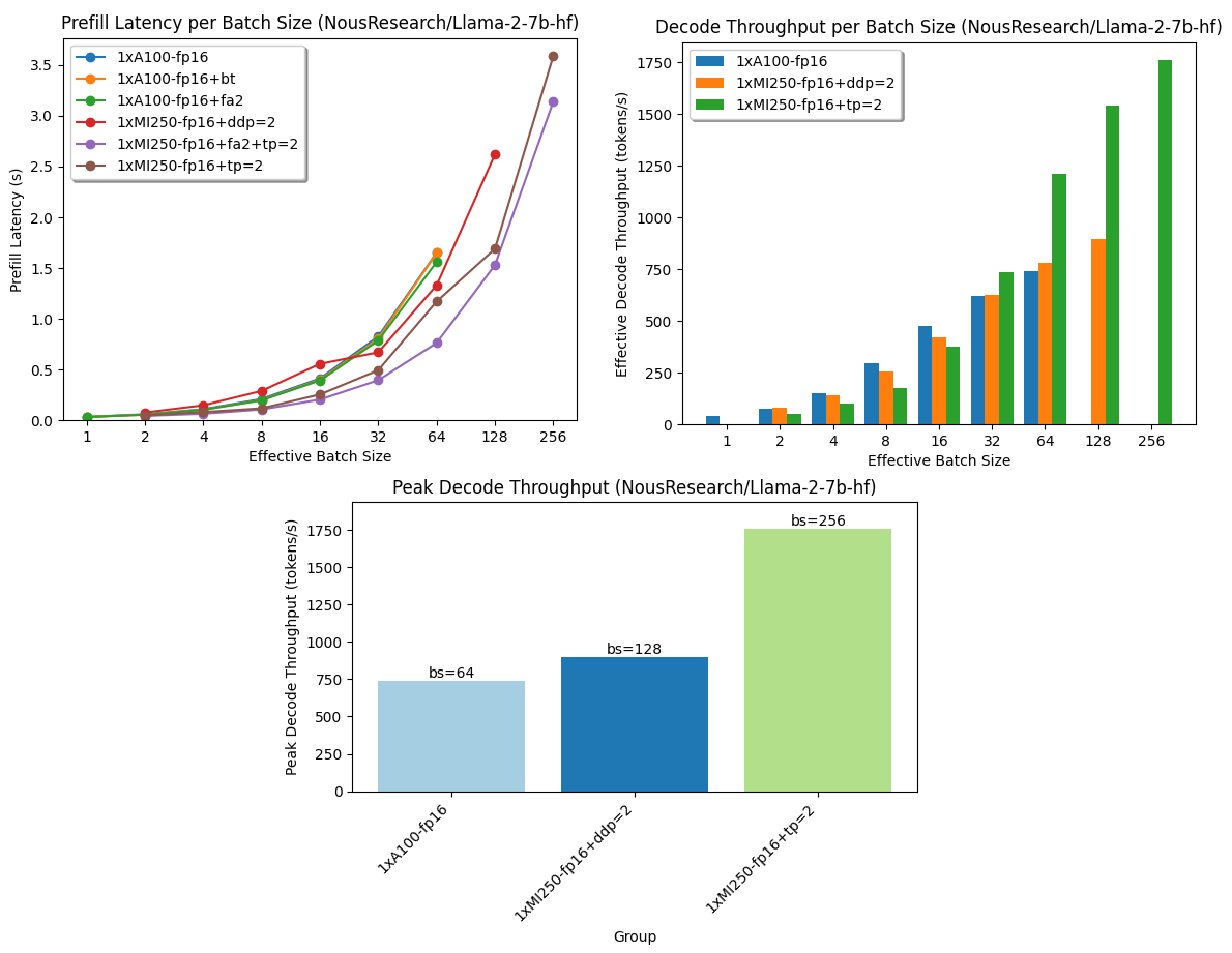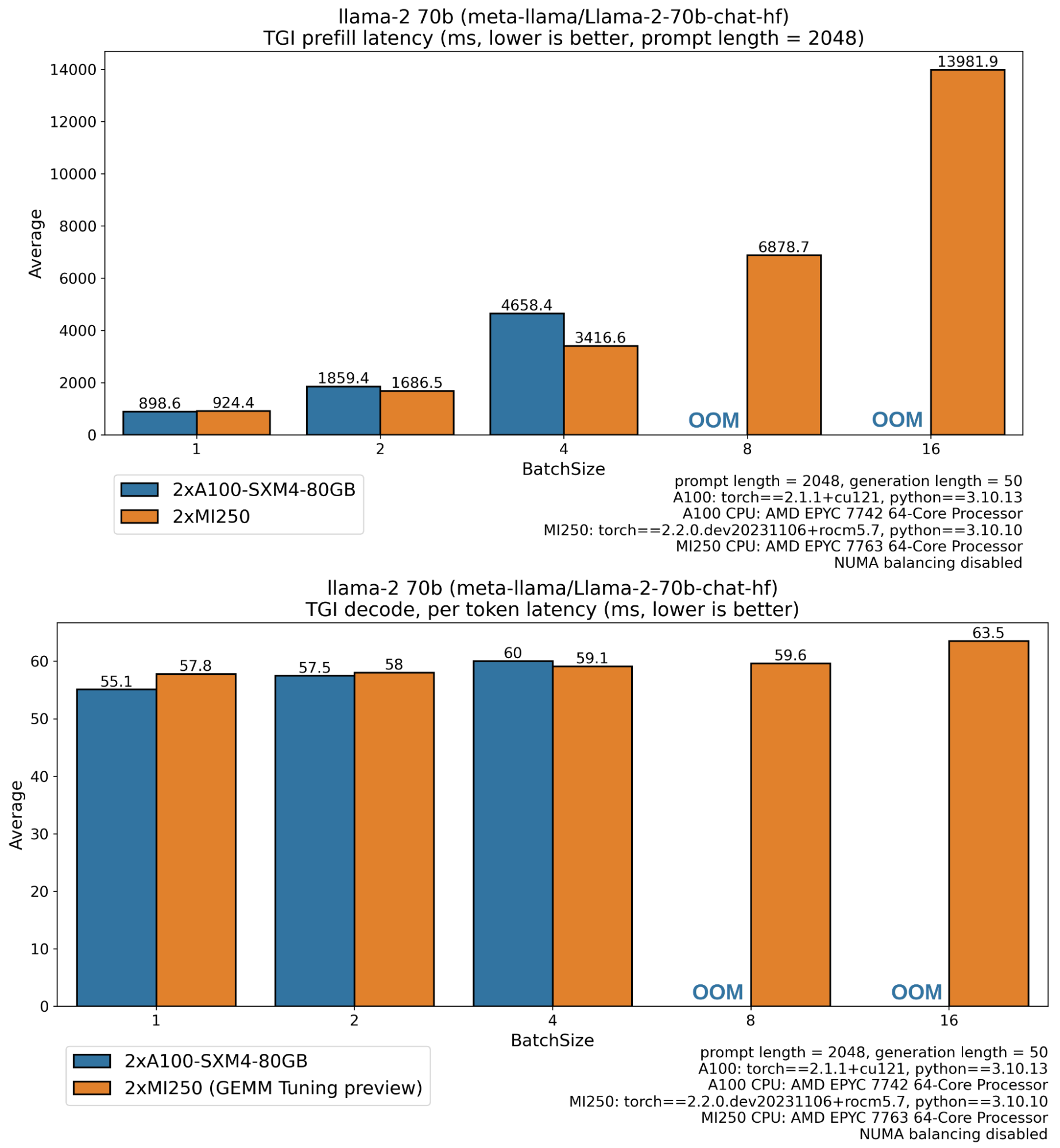 A100 缺失的條形圖對應於記憶體不足錯誤,因為 Llama 70B 的權重在 float16 中為 138 GB,並且中間啟用、KV 快取緩衝區(序列長度 2048、批次大小 8 時 >5GB)、CUDA 上下文等需要足夠的空閒記憶體。Instinct MI250 GPU 具有 128 GB 全域性記憶體,而 A100 具有 80GB,這解釋了 MI250 能夠執行更大工作負載(更長序列、更大批次)的原因。