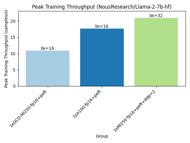 如下所示,執行訓練基準測試時,一張 MI250 卡可以容納更大的訓練樣本批次,並實現更高的訓練吞吐量。