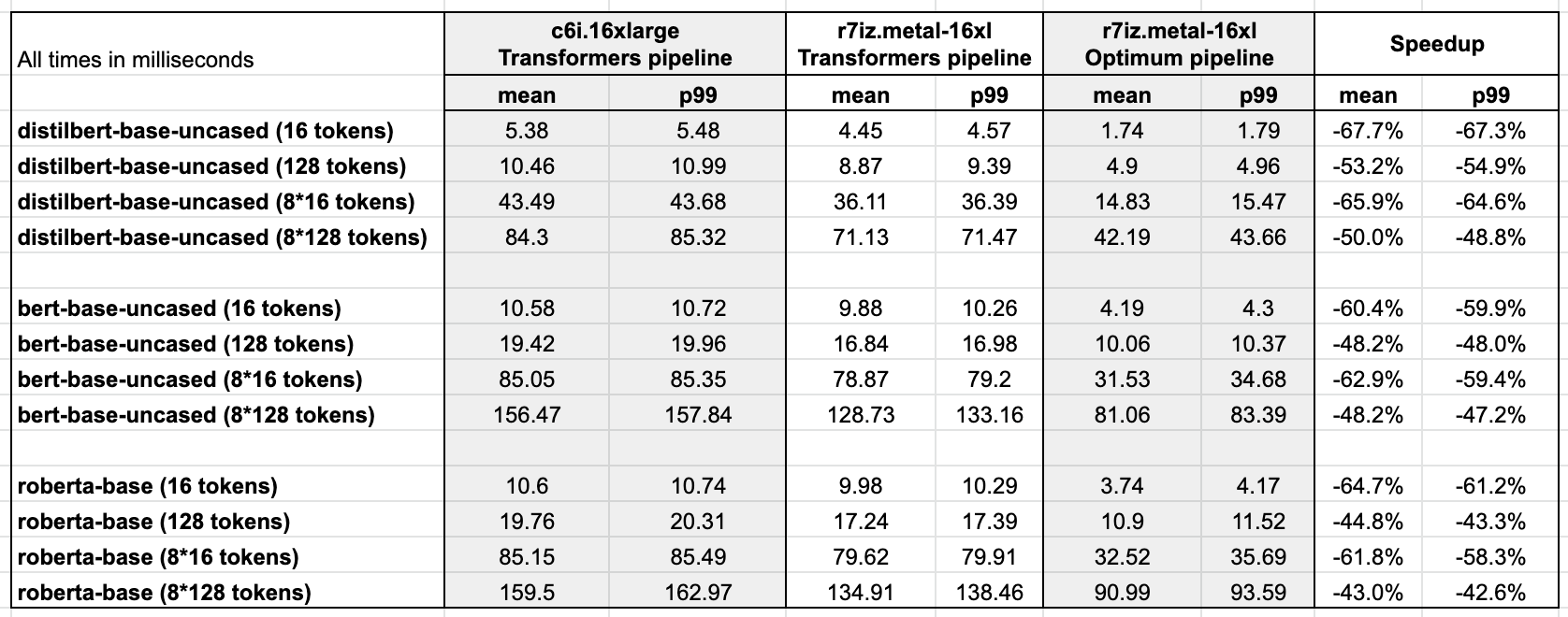 使用 16-token 和 128-token 兩種長度的句子,我們將測量單次推理和批處理推理的平均預測延遲和 p99 預測延遲。這應該能讓我們很好地瞭解在實際場景中可以預期的速度提升。