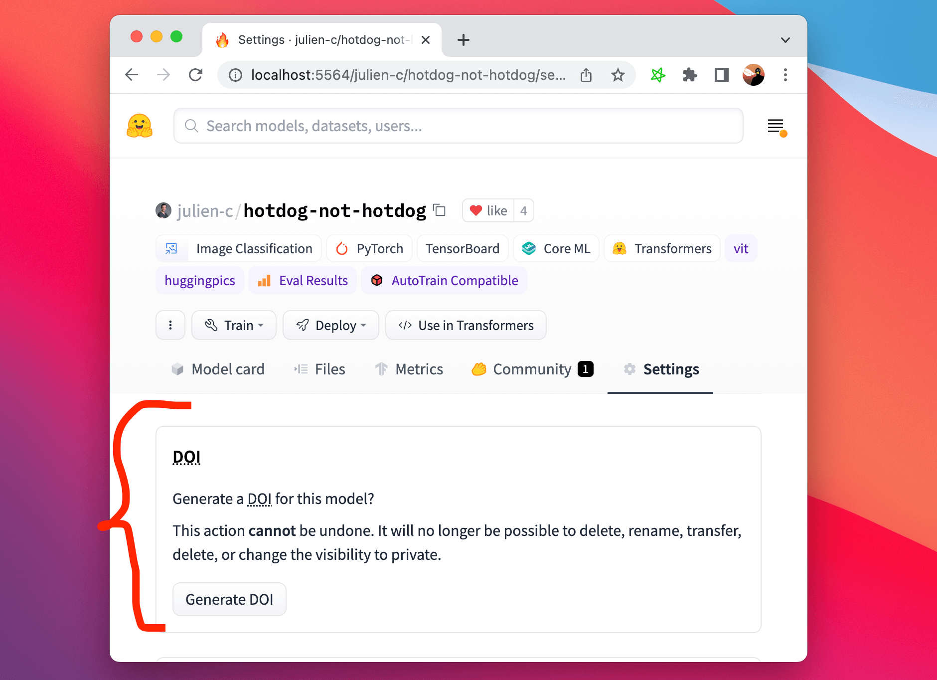 我們與 DataCite 合作,允許 Hub 的註冊使用者為其模型或資料集申請 DOI。一旦他們填寫完必要的元資料,就能獲得一個嶄新的 DOI 🌟!