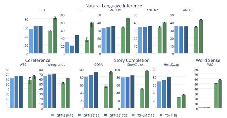 來自 Big Science 專案的最新模型也非常令人印象深刻。如研究論文中所示的圖表,他們的 T0 模型在許多工上都優於 GPT-3,同時模型大小僅為 GPT-3 的 1/16。