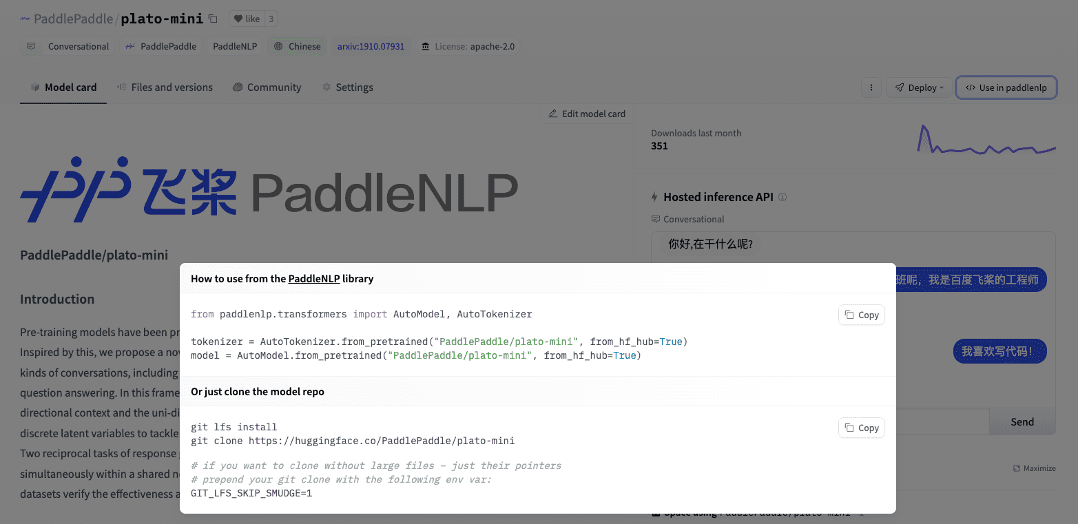 如果您想檢視如何載入特定模型,可以點選 Use in paddlenlp