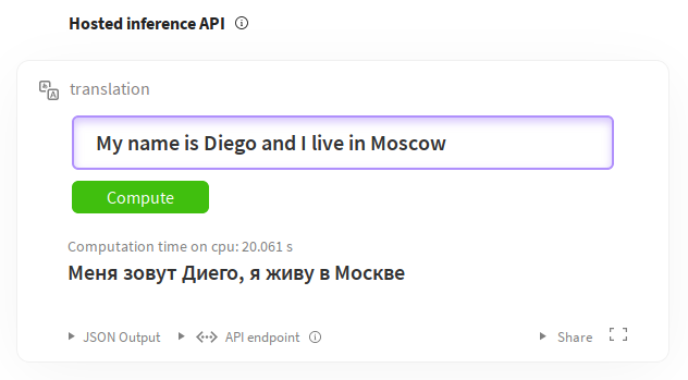 如您所見,我們定義了語言、標籤、許可證、資料集和指標。有關編寫這些內容的完整指南,請參閱模型共享和上傳。其餘部分是描述模型及其細微差別的 Markdown 文件。您還可以透過推理小部件直接從模型頁面試用模型。例如,對於英語到俄語的翻譯:https://huggingface.co/facebook/wmt19-en-ru?text=My+name+is+Diego+and+I+live+in+Moscow。