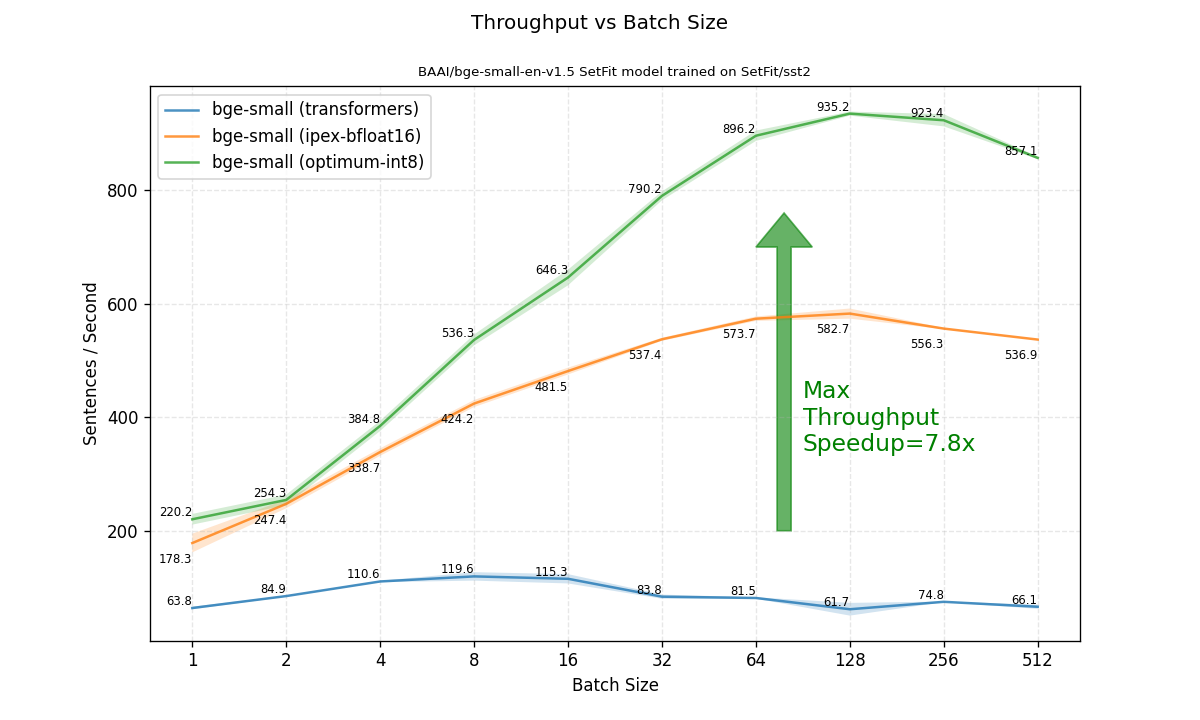 在這篇博文中,我們展示瞭如何使用 🤗 Optimum Intel 中的量化功能來最佳化 SetFit 模型。在運行了一個快速簡便的訓練後量化過程後,我們觀察到準確率水平得到了保持,而推理吞吐量則提高了 7.8 倍。這種最佳化方法可以輕鬆應用於任何在英特爾至強(Xeon)上執行的現有 SetFit 部署。
