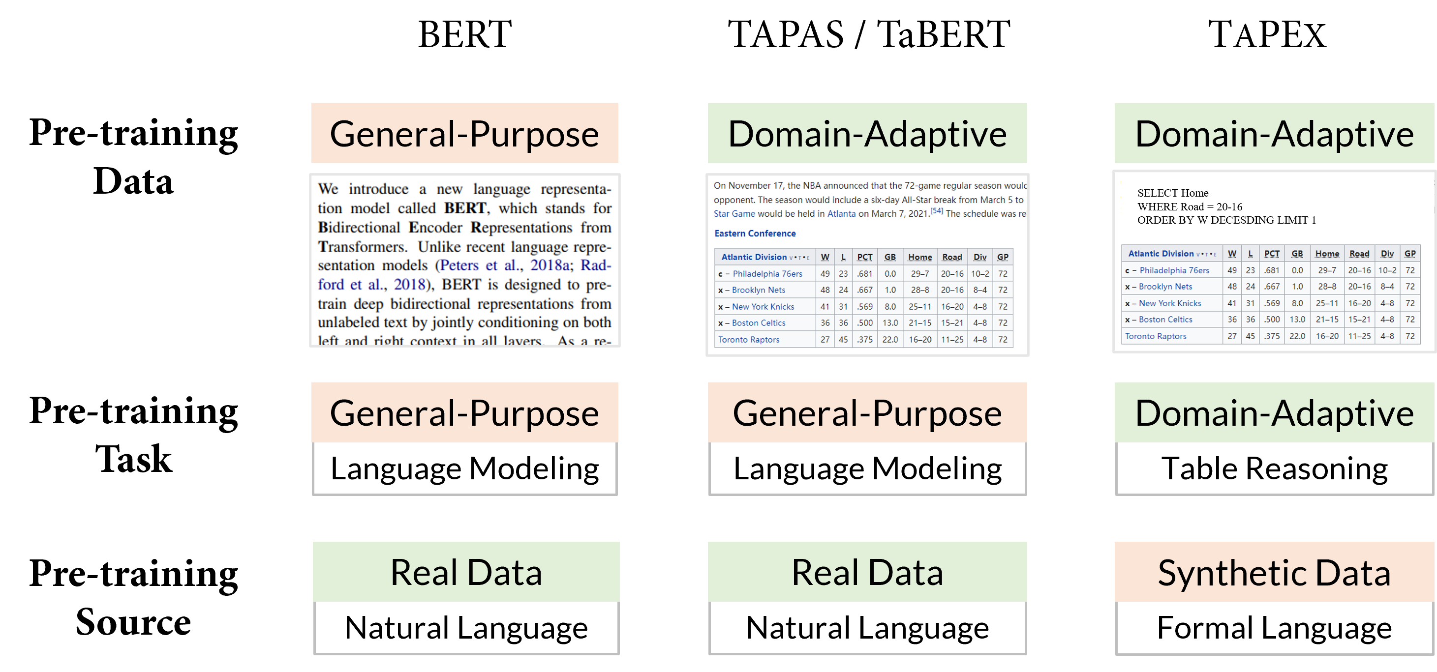 最早的表格預訓練工作,如來自 Google Research 的 TAPAS(同樣在 🤗 Transformers 中可用)和來自 Meta AI 的 TaBERT,已經揭示了收集更多 領域自適應 的資料可以提升下游效能。然而,這些先前的工作主要採用 通用 的預訓練任務,例如語言建模或其變體。TAPEX 探索了一條不同的道路,它犧牲了預訓練源的自然性,以獲得一個 領域自適應 的預訓練任務,即 SQL 執行。下面是 BERT、TAPAS/TaBERT 和我們的 TAPEX 的圖形化比較。