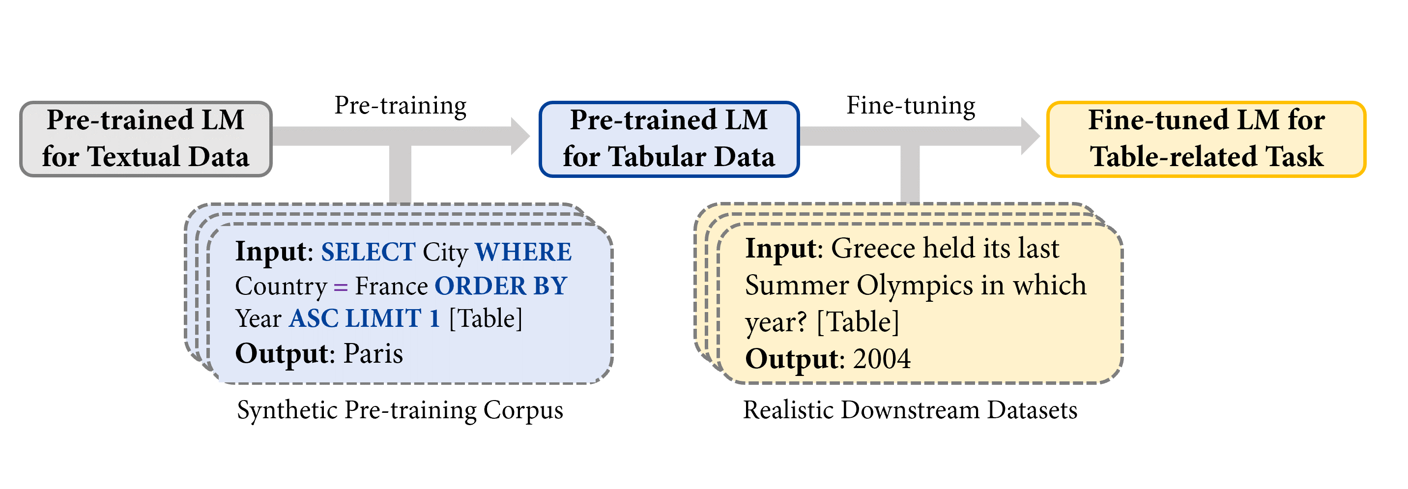 下圖說明了預訓練過程。在每一步,我們首先從網上獲取一個表格。示例表格是關於奧運會的。然後我們可以取樣一個可執行的 SQL 查詢 SELECT City WHERE Country = France ORDER BY Year ASC LIMIT 1