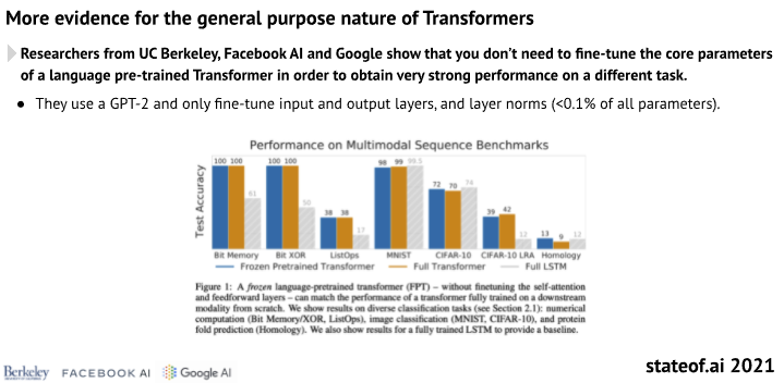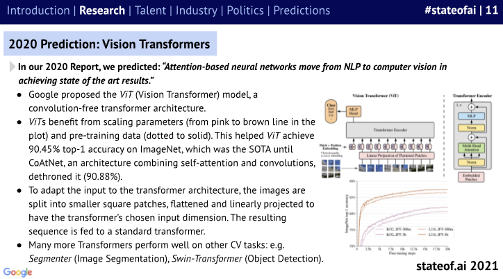 人工智慧現狀報告指出:“Transformer 架構已遠遠超越自然語言處理,正成為機器學習的通用架構。” 例如,最近的模型如谷歌的Vision Transformer(一種無卷積 Transformer 架構)和CoAtNet(融合了 Transformer 和卷積)在 ImageNet 上重新整理了影像分類的基準,同時訓練所需的計算資源更少。