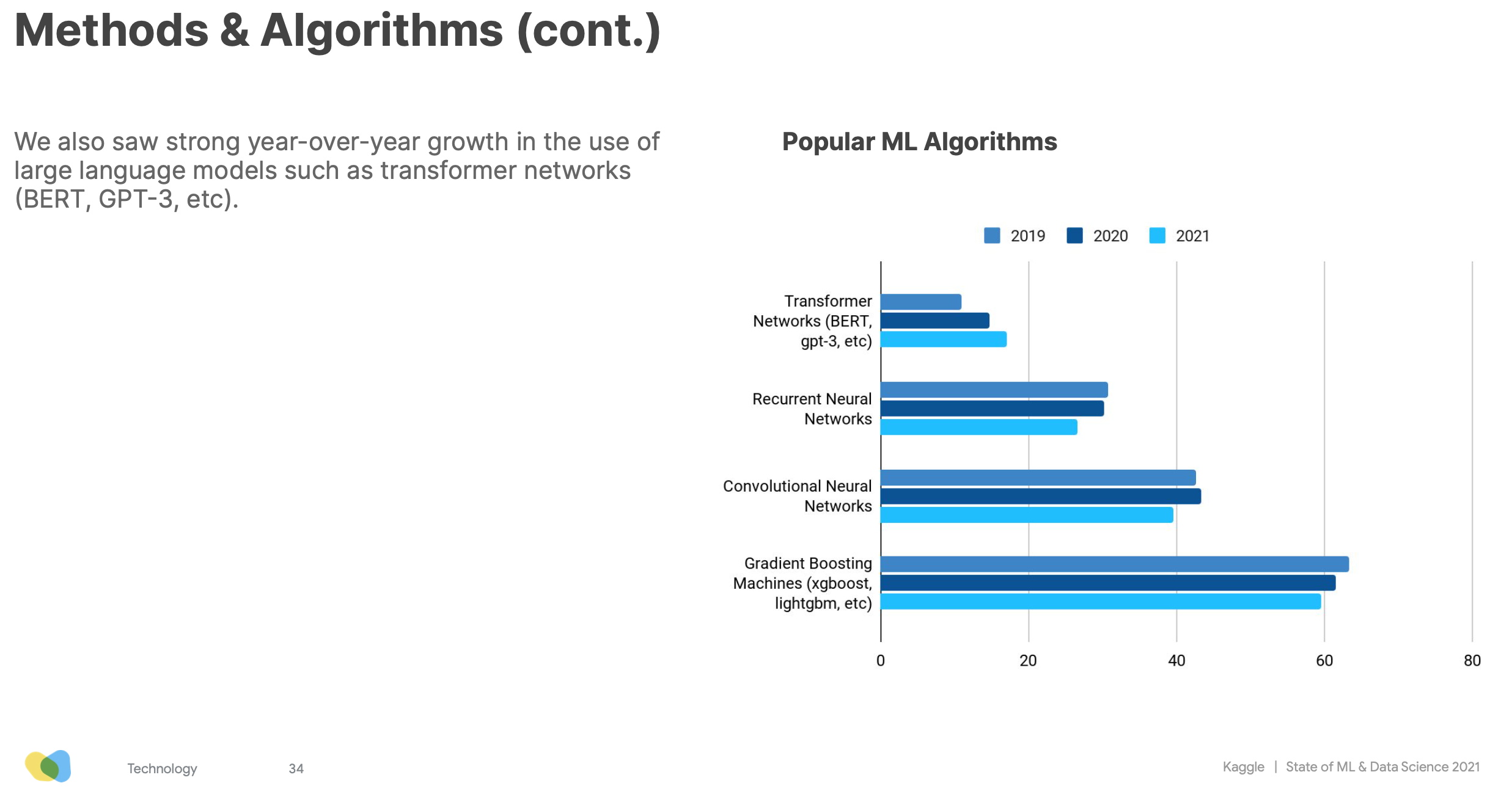 Kaggle 的調查也印證了 Transformer 的興起。其使用量逐年增長,而 RNN、CNN 和梯度提升演算法則在減少。