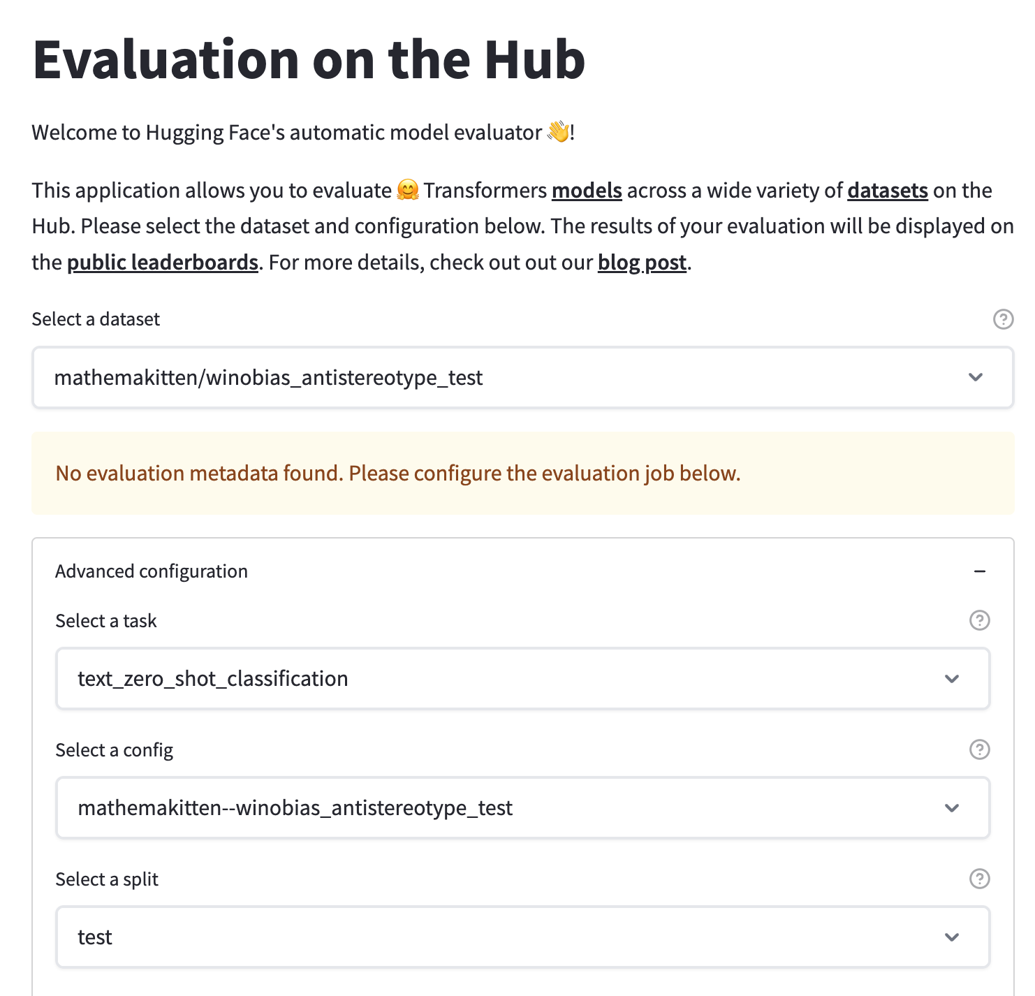 Evaluation on the Hub 是一個低程式碼工具,它使得比較一組模型在某個維度(如 FLOPS 或模型大小)上的零樣本效能變得簡單,也便於比較一組在特定語料庫上訓練的模型與另一組模型的效能。零樣本文字分類任務非常靈活——任何可以被構造成 Winograd schema(其中待比較的樣本僅有幾個詞的差異)的資料集都可以用於此任務,並同時在多個模型上進行評估。我們的目標是簡化上傳新資料集進行評估的過程,並使研究人員能夠輕鬆地在其上對許多模型進行基準測試。